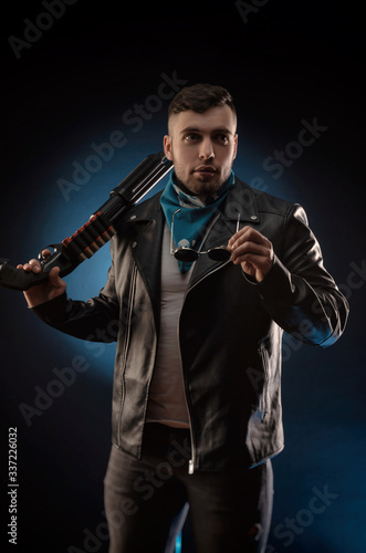 guy in a leather jacket with a shotgun