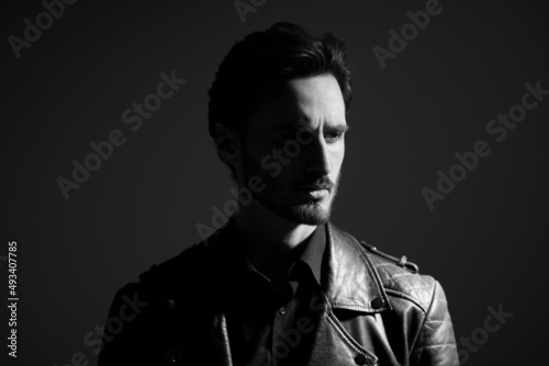 fashion, black-and-white, man, brutal, leather, adult, anxious, background, bearded, black, boy, brunet, calm, caucasian, confident, dark, dark-haired, dramatic, emotion, face, frowning, guy, photogenic, italian, jacket, male, manly, masculine, mature, model, modern, moustache, nightlight, people, person, portrait, serious, shadow, shirt, strong, studio, worried, young