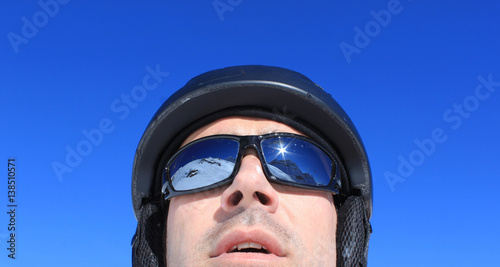 skier, guy, reflections, mountain, snow, cover, reflect, sunglasses, range, sun, helmet, looking, view