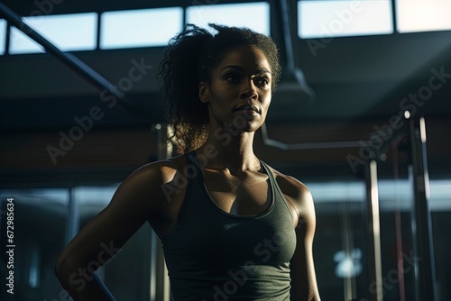 Gym and fitness concept. Strong athletic African American woman wearing sportswear.