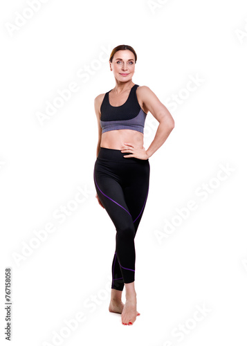 Gym Fitness. Smiling adult woman. Isolated over white background