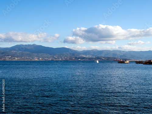 sea, water, sky, coast, mountain, blue, panorama, travel, landscape, boat, island, ocean, beach, nature, bay, ship, greece, cloud, city, view, lake, harbor, tour tourism, port, coastline
