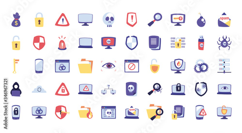 flat, style, icon, set, money, bag, padlock, alarm, triangle, shield, lamp, key, smartphone, website, gear, computer, laptop, file, skull, eye, sharpened, hacker, cloud, computing, arrow, flames, code, lupe, bomb, document, usb, forbidden, spider, spam, envelope, web, hosting, vector, hack, information, warning, protection, danger, alert, security, infected, secure, bankruptcy, threat