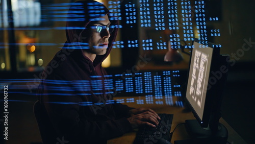 business, man, hacker, cracking, closeup, night, office, working, cyberspace, breaking, datum, hologram, late, phishing, attack, writing, computer, keyboard, information, spy, hacking, virus, monitoring, technology, cyberspace, dangerous, goggles, evening, display, dark, room, guy, code, security, system, corporate, server, database, center, workplace, alone, high technology, focused, website, slow motion