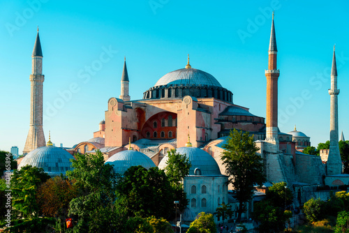 Hagia Sophia Mosque in Istanbul is a place of worship for Muslims. The photo of the building, which is surrounded by green trees, was taken on a sunny day.