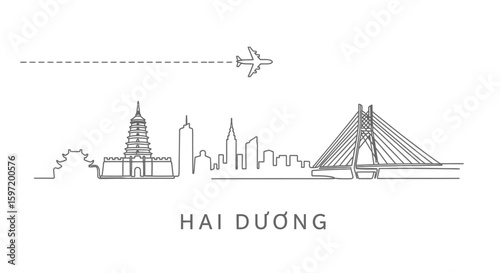 vietnam, city, skyline, minimal, line art, city landscape, travel, aeroplane, bridge, architecture, building, landmark, urban, tour tourism, southeast asia, asia, asian, destination, modern, illustration, vector, outline, design, background, white, simplicity, single line, graphic, plane, aircraft, flight, pagoda, temple, structure, historical building, journey, trip, vacation, vietnamese, cultural, culture