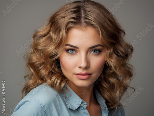 Hair, healthy long hair, hairstyle, make up. Beautiful woman with long hair, blue eyes and red lips