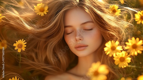 Hair model with loose, flowing hair intertwined with bright yellow daisies, captured in a soft breeze, outdoor garden setting with sunlight filtering through the leaves,