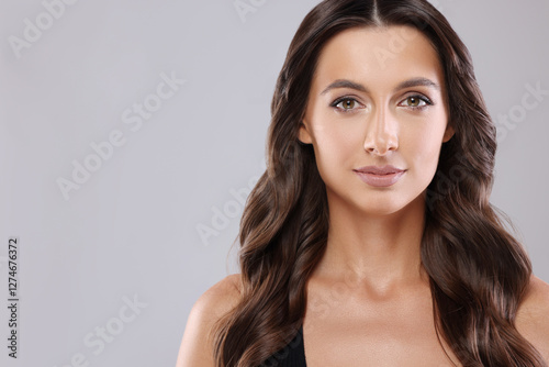 Hair styling. Portrait of beautiful woman with wavy long hair on grey background, space for text