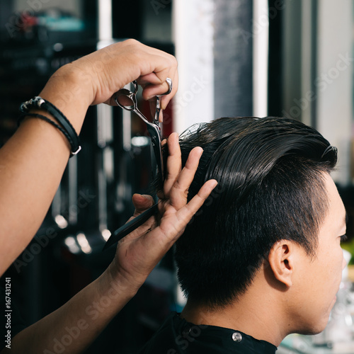 man, hairdresser, hairstylist, barber, comb, professional, business, barbershop, closeup, hand, cutting, trimming, client, client, coiffure, process, head, tool, wet, styling, skill, experienced, sharp, haircut, instrument