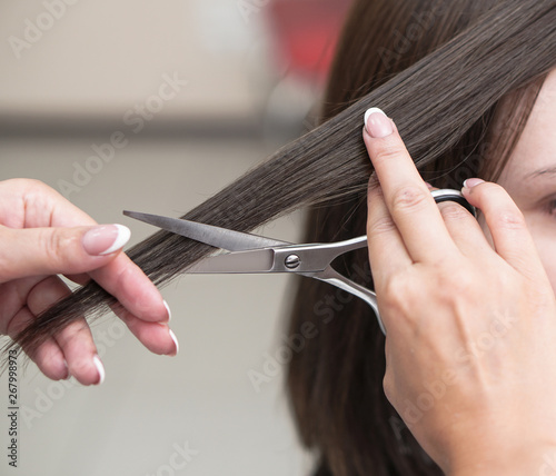 Haircutting process in the hairdresser. woman in the salon smoothes her hair. Hands with scissors. Stock photos for design
