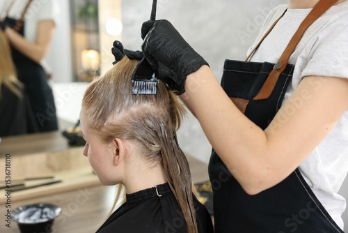 Hairdresser applying dye on woman's hair in salon, closeup