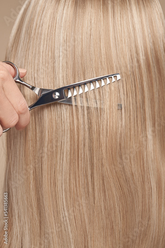 Hairdresser cuts long blonde hair with scissors. Hair salon, hairstylist. Care and beauty hair products. Dyed hair