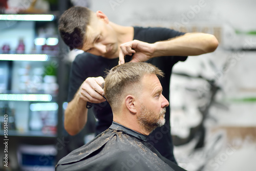 Hairdresser is cutting hair of handsome bearded mature man in salon. Stylist making hairstyle with electric shaver for person in barbershop. Services of a professional stylist. Fashion haircut