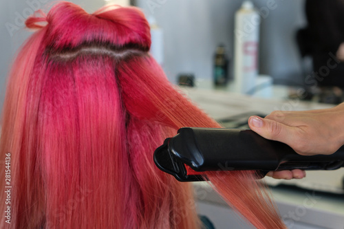 Hairdresser makes hairstyle to client using crimping irons. Hairdressing services. Girl with colorful dyed Hair. Model with perfect healthy dyed hair. Ombre hairstyle.