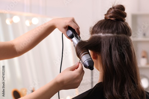 Hairdresser using curling hair iron while working with woman in salon, closeup