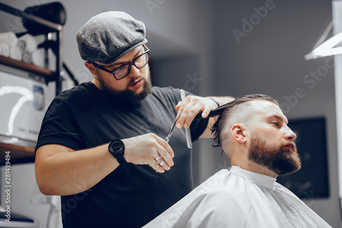 Hairdresser with a client. Man with a beard. Guy in a barbershop
