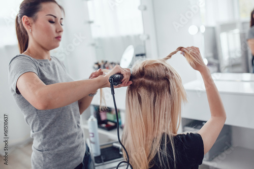 Hairdresser-stylist does the styling to the girl, using hair styling. Corrugated on the hair.
