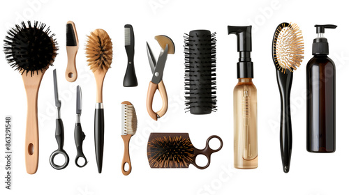 Hairstylist's setup with hairdressing tools and products, PNG file, transparent background, isolated on white