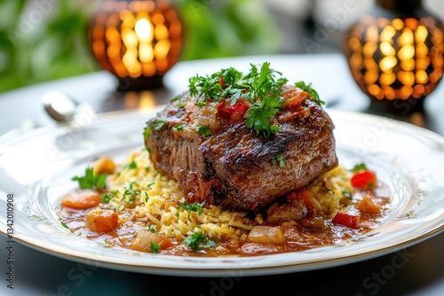 Halal food religion faith connection. Delicious steak served on a bed of rice with garnishes.
