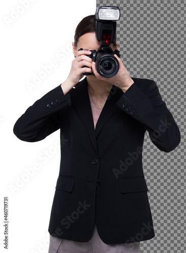 Half body 20s Asian woman hold dslr camera wear blazzer suite as journalist photographer, isolated