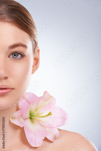 half, face, woman, dermatology, beauty, studio, portrait, natural, model, background, skin, closeup, flower, care, skincare, flower, wellness, cosmetic, grooming, cosmetic, smooth, glow, shine, female, young, girl, alone, adult, bare, person, feminine, healthy, health, lady, confident, fresh, plant, carefree, facial, hygiene, treatment, clean, confidence, routine, positive, simple, organic