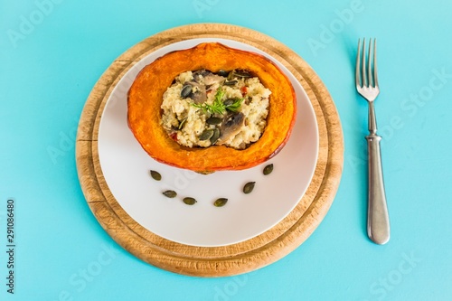 Half of baked orange pumpkin stuffed with millet grains and mushrooms, a healthy homemade vegetarian dinner served on white plate with seeds. Wooden chopping board and silver fork on turquoise table.
