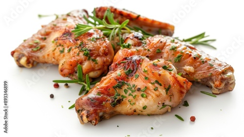Half-cooked chicken wings with herbs, fast home food on white background.