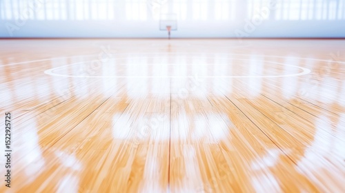 Half-Court Line on Polished Basketball Court, showcasing gleaming wood texture, vibrant court markings, inviting atmosphere, emphasizing the essence of the game