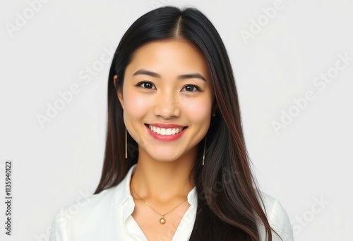 asian, people, background, happiness, long, simple, human, direct, portrait, inviting, necklace, woman, warm, space, blouse, white, minimalistic, dark, hair, copy, professional, clean, gaze, modern, camera, smiling