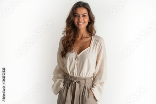 Half-Length (Waist-Up) portrait of young stylish smiling Omani female model in bohemian wear isolated on pure white background looking at camera