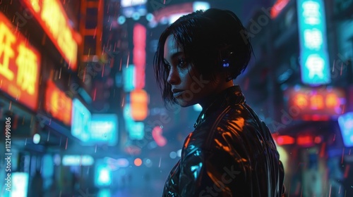 Half-robot cyberpunk woman Under the bright neon lights and acid rain of the city,