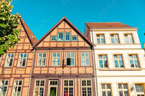 Half-timbered historic houses at Schlachtermarkt in the old town of Schwerin, Germany