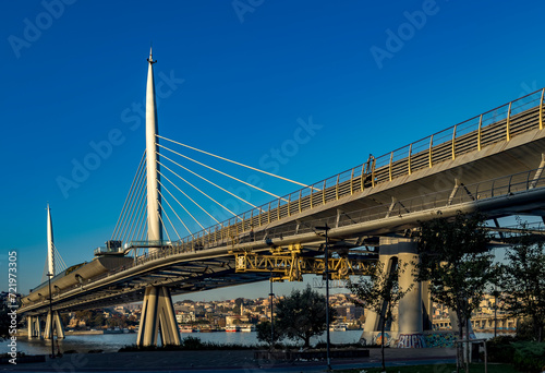 Halic metro bridge and Golden Horn. Metro station on Eminonu district estuary bridge. The bridge has a special arc.
