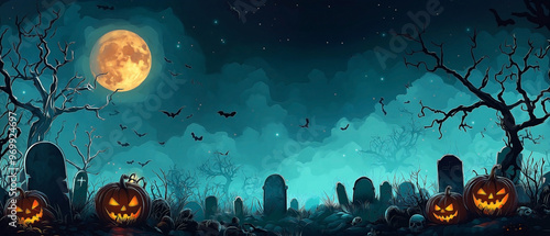 Halloween background featuring pumpkins, a glowing moon, and a dark sky