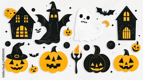 halloween, pumpkin, bat, set, vector, cartoon, ghost, cat, holiday, illustration, sorcerer, icon, autumn, hat, spider, skittish, skull, horror, moon, design, silhouette, october, scarey, night, celebration, yellow, black