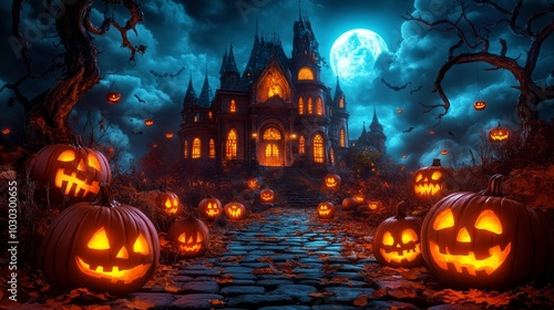 Halloween background wallpaper, fairytale castle, magical atmosphere, Halloween banner background.