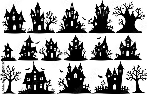 halloween background with house, castle and bats, halloween, house, night, moon, castle, bat, silhouette, holiday, scary, illustration, horror, cartoon, haunted, tree, vector, dark, autumn, spooky, ba