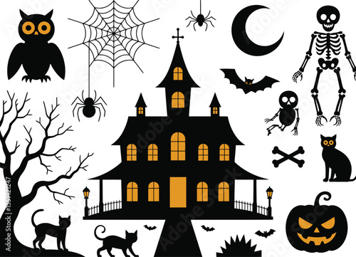 halloween, house, moon, night, castle, holiday, vector, silhouette, autumn, bat, scarey, pumpkin, haunted, horror, cartoon, illustration, tree, skittish, dark, bat, evil, party, october, celebration, art