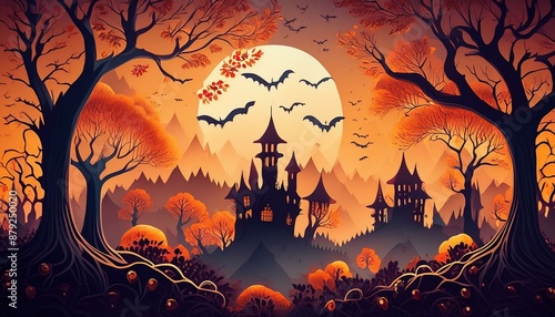 halloween, night, tree, pumpkin, moon, bat, vector, silhouette, autumn, holiday, horror, dark, house, scarey, illustration, skittish, cartoon, bat, orange, evil, october, castle, celebration, design, black
