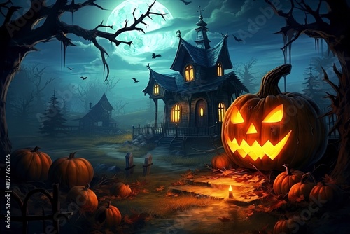 halloween, pumpkin, night, autumn, moon, horror, bat, holiday, skittish, dark, scarey, tree, vector, illustration, castle, celebration, silhouette, evil, black, design, october, orange, cartoon, sky, fear, card, party, art, house, cemetery, haunted, bat, lantern, hill, ghost, creepy