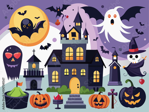 Halloween background with pumpkins, ghosts, bats and haunted house.