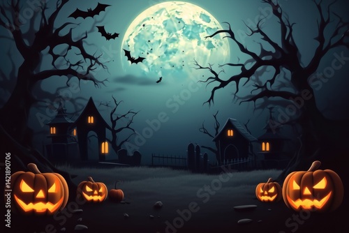 Halloween background with pumpkins, haunted house and full moon. Spooky Halloween banner with a Copy Space. Halloween Background with Copy Space. 2d illustration for your design.