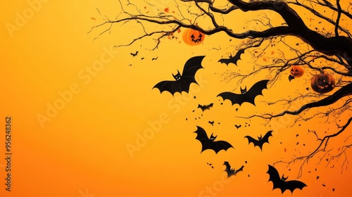 Halloween Banner with Copy Space Featuring Bats, Pumpkins, and Sycamore Tree Branches in Autumn. AI generated illustration