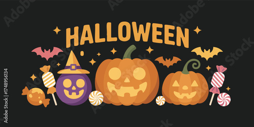 halloween, banner, pumpkin, bat, candy, star, text, orange, purple, holiday, cartoon, art, vector, illustration, trick, treat, festive, skittish, sweet, autumn, october, sorcerer, hat, season, design, graphic, fun, card, event, celebration, decoration, icon, pattern, poster, drawing, artwork, element, symbol, background, image, clip, decorative, party