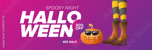 Halloween big sale banner with witch legs and funky pumpkin with sunglasses on night spooky background. Halloween sape poster design template