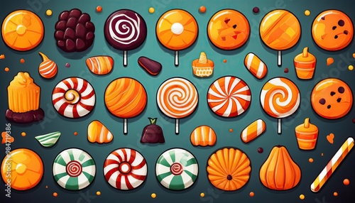 Halloween Candy Icons A fun icon set featuring various Halloween treats like candy corn, lollipops, wrapped candies, chocolate bars, and caramel apples.