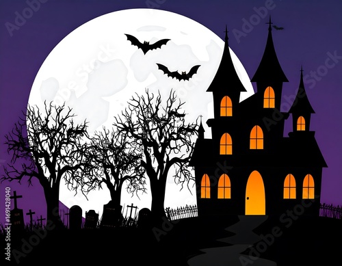 halloween, castle, moon, night, skittish, haunted, tree, cemetery, bat, silhouette, dark, gothic, scarey, full, window, lit, orange, path, gravestone, cross, creepy, fantasy, illustration, vector