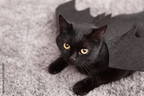Halloween celebration. Cute cat with bat wings on rug, above view. Space for text