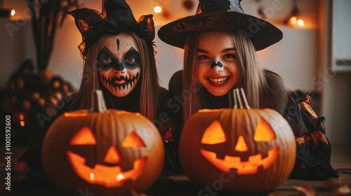 Halloween Celebrations with Witches and Pumpkins in an Autumn Forest Setting
